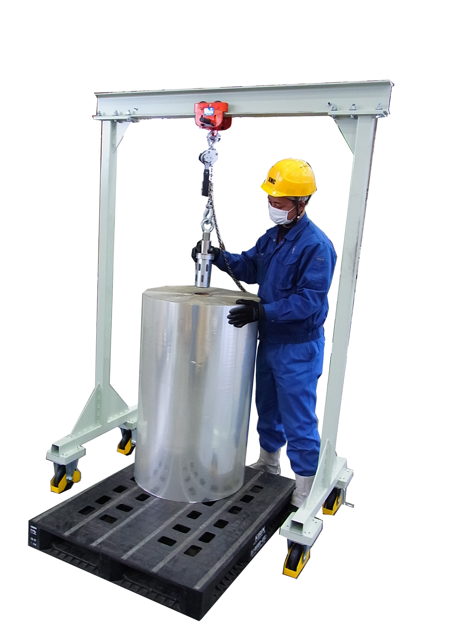 台車上のロールの紙管内に吊具を入れて、レバーブロックで持ち上げた後に、パレットの任意の位置まで運んで降ろします。 最大重量500kg未満のロールを移動できます。